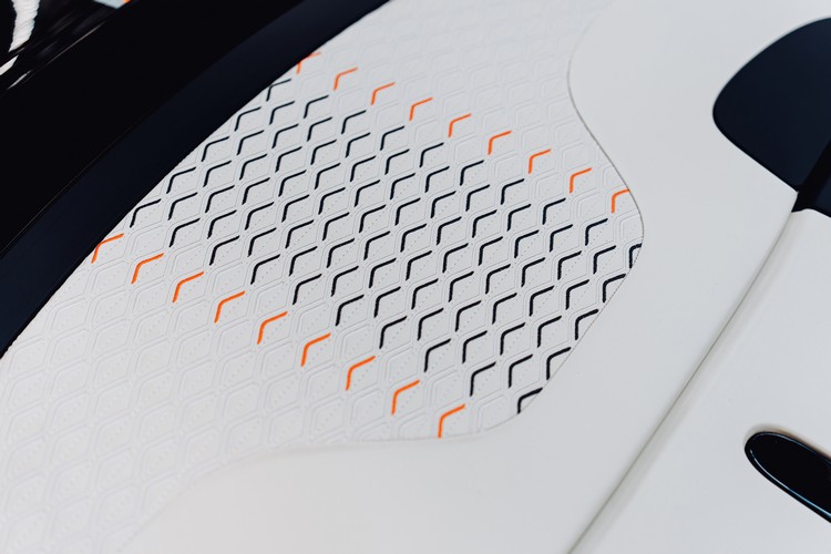 在車尾,這些元素透過後座艙蓋上相同圖案的客製化刺繡連接。Batur 獨特的矩陣式水箱護罩採用亮面鯨魚黑(Beluga)搭配柑橘橘(Mandarin orange)點綴,而五輻式鋁圈也採用相同的底色和點綴色調。
