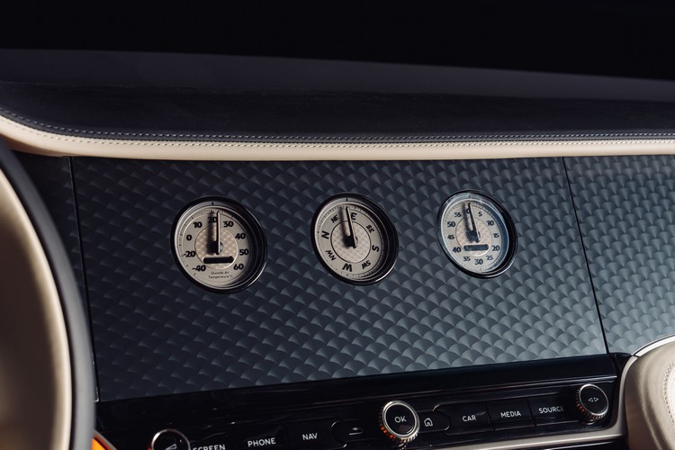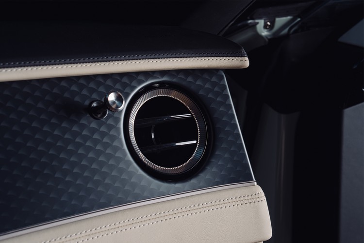 車室內裝透過兩種對比色調,將駕駛座與乘客座視覺上區隔開來:駕駛座側為鯨魚黑(Beluga black),乘客座則為亞麻白(Linen)。駕駛座椅採用鯨魚黑皮革和 Alcantara 材質,並以 Mulliner 的 Batur 圖案在座椅側墊和車門飾板上加入亞麻白和橘色對比縫線點綴。一條橘色皮革飾帶環繞駕駛者,從中控台駕駛側延伸至儀表板,並無縫地延續至車門腰線下方。