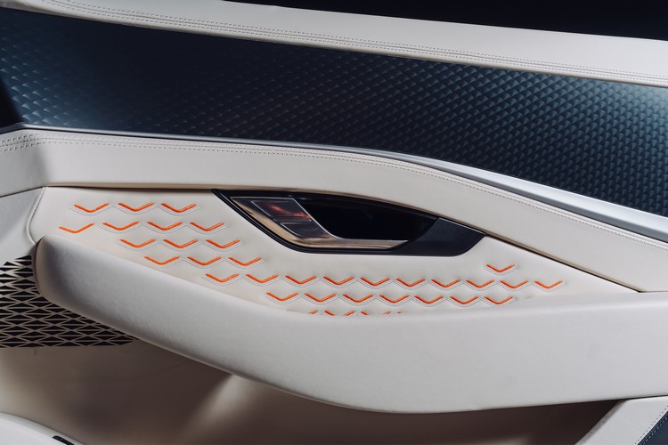 與之形成鮮明對比的是則是乘客座上的跑車座椅,採用亞麻色皮革和 Alcantara材質,並飾有橘色細節。座椅和車門內飾上的 Batur 圖案細節以亞麻色為底,並飾有橘色對比縫線。