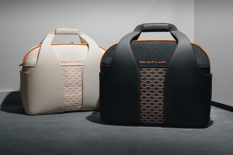 儀表板和車門腰線採用精緻的緞面黑色飾面,中控台則選用亮面鯨魚黑(Beluga)飾板。外側錶盤邊框為鯨魚黑飾面,而錶盤本身則為淺鈦金屬飾面。方向盤以鯨魚黑(Beluga)皮革包覆,內層為亞麻白(Linen)飾面,並以柑橘色(Mandarin)交叉縫線點綴,方向盤頂部中心設有鈦金屬加工部件。其他實心鈦金屬加工部件包括換檔撥片、方向盤撥桿上的旋鈕、中控台旋鈕、空調出風口控制鈕,以及儀表板兩端空調出風口的內環。 發光的外側門檻踏板上刻有 Batur 銘牌和系列編號。