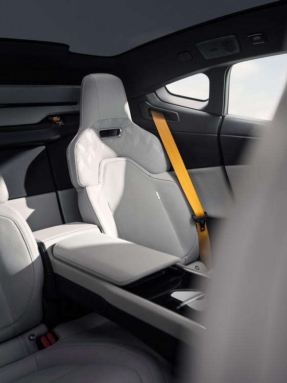 POLESTAR 5 採 4+1座設計。前座椅是與Recaro合作開發,低坐點搭配包覆性與北歐舒適感,標配 Charcoal MicroTech 材質,另提供 Bridge of Weir Nappa 皮革(Charcoal 或 Zinc)。這款皮革來自食材副產品,無鉻鞣製,並具備通風、按摩與加熱功能。後座延續前座設計,可獨立電動傾斜,搭配中控扶手操控四區恆溫空調、加熱、通風與按摩。前排電池設計出「foot garage」讓後座乘員有更自然的腿部空間。