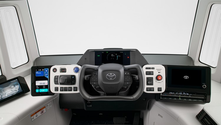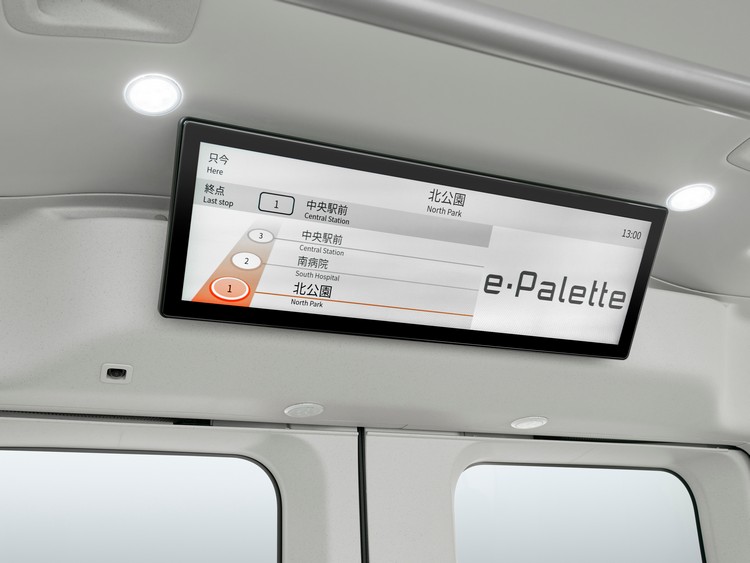 在先進技術配備上,e-Palette導入了「線傳轉向系統」,提供次世代的操作感受,透過減少方向盤操作量來減輕駕駛負擔,非圓形的方向盤設計在視覺上也很有科技感。車內外配備數位電子看板,可依據使用情境顯示內容。同時提供客戶可自行編輯的看板軟體來發布各種資訊。