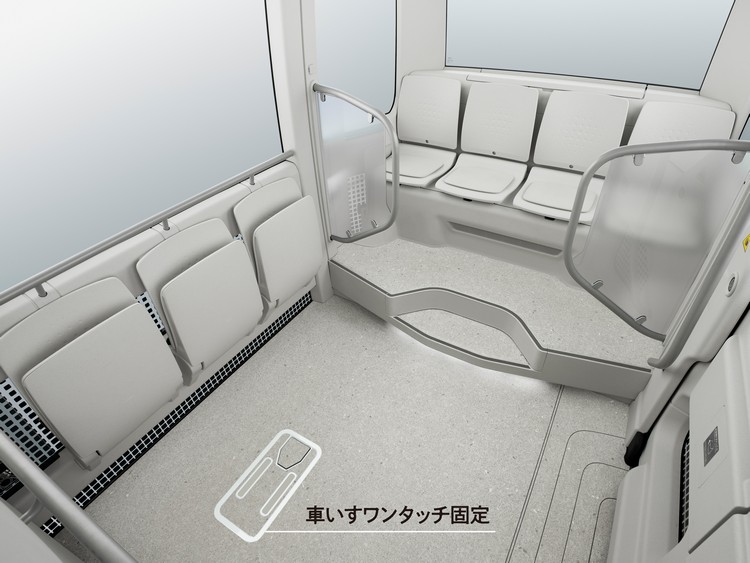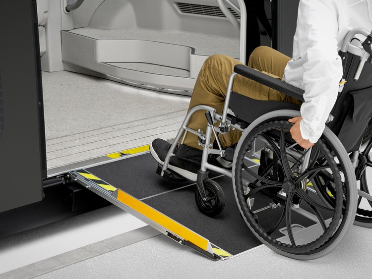 低地板、大開口滑門設計,可快速上下車。透過車高調整功能實現低地板,電動斜坡板則可讓輪椅使用者在人行道高度 15 公分的情況下無需協助即可自行上下車。亦可選配輪椅一鍵固定等功能。除了安心下車輔助系統外,車室內監控系統會監控車門周圍,以協助確認車門開關的安全性。