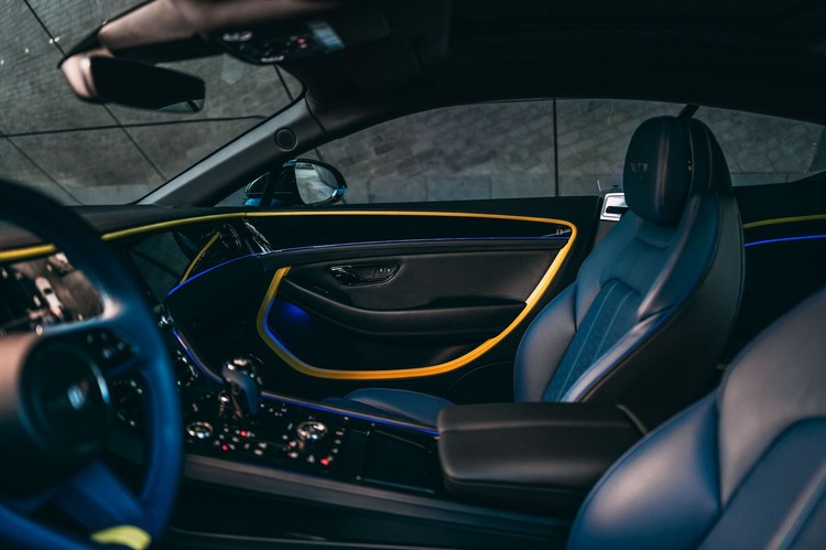 車室配色以 Beluga 黑與 Ocean Blue 海洋藍皮革為主,並透過 Citric Yellow 檸檬黃作為點綴色,加上座椅滾邊採用鮮明的 Klein Blue 克萊因藍,營造層次豐富的視覺效果。車門飾板與迎賓燈動畫則取材自維梅爾 1658 年的名作《小街》(The Little Street)中翻湧的雲層意象。中控檯與腰線飾板為 Piano Black 鋼琴黑飾面,而多項獨特細節中,包含 BENTLEY 旋轉顯示螢幕的內圈飾環與滾花外框,皆以 Klein Blue 上色,展現高度客製化工藝。