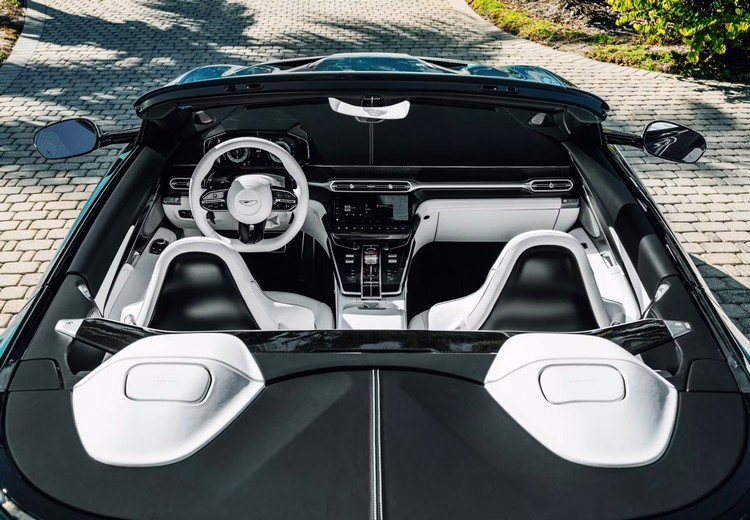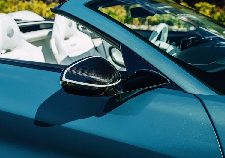 外觀部分,Wave Edition 採用名為 Q Iridescent Sapphire 的專屬藍色塗裝,在不同光線角度下會隱約透出綠色光澤,其靈感來自佛羅里達南部大沼澤地(Everglades)周邊水流的自然律動。搭配亮黑色調碳纖維上下車身套件,並與延伸式車身同色上部塗裝完美融合,不僅強化整體視覺張力,也進一步突顯 Vanquish Volante 流暢而富有張力的車身輪廓。