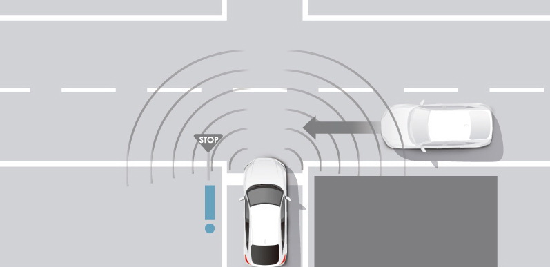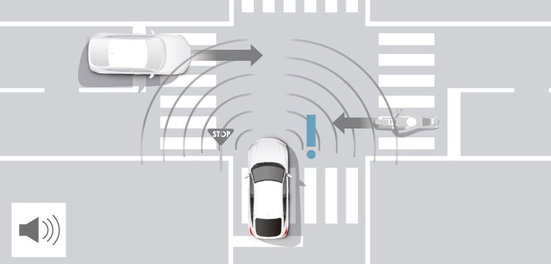 在路口/巷口以低速行駛或停車狀態下起步時,左右前方若有車輛橫越接近時系統就會提醒車主,若系統判斷有發生碰撞危險時會以警示音與儀表板上的燈號來警示駕駛避免發生意外。