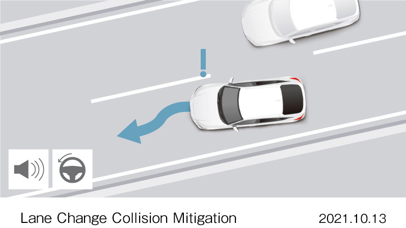 在切換車道時,避免被該車道後方的車輛所追撞,若有與從後視鏡視野死角接近的後側車輛發生碰撞的危險時,系統便會發出警示同時也會輔助方向盤操作來避免意外。