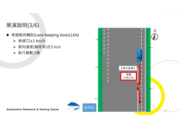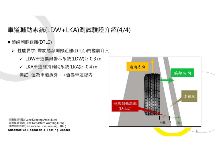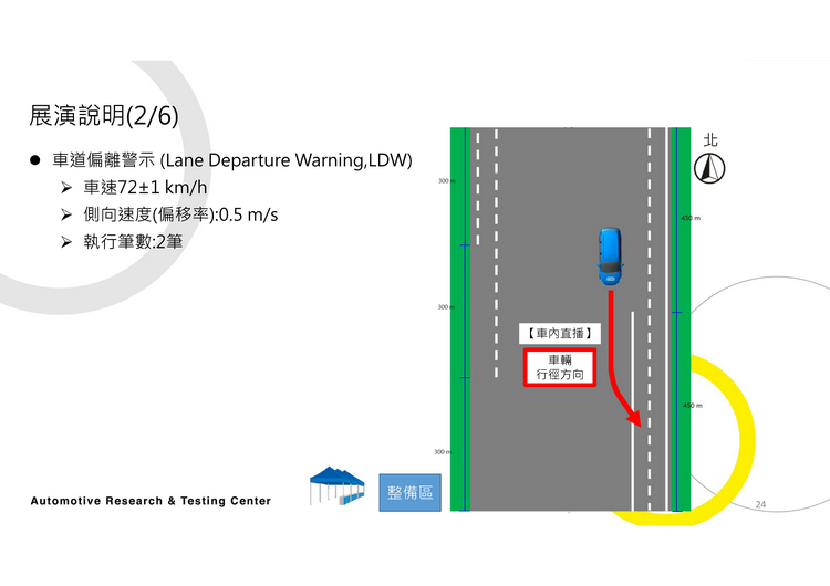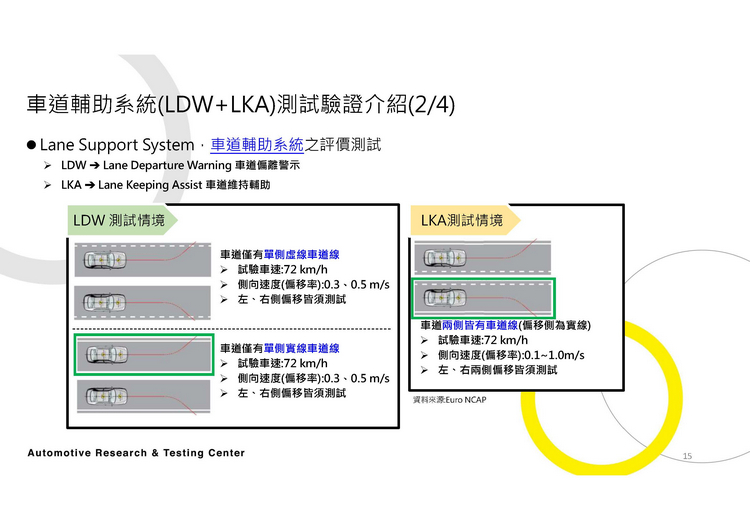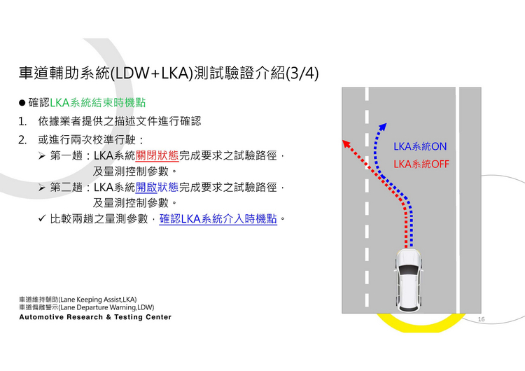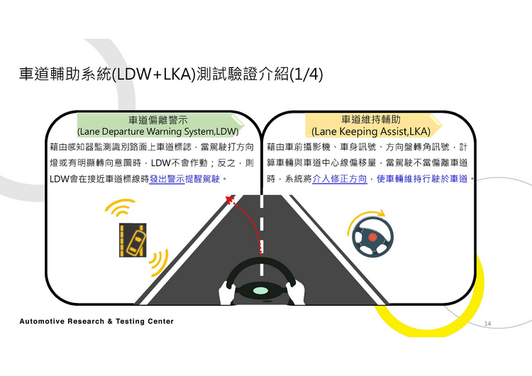 不過,這次正好有這個機會ARTC車輛研究測試中心向大家展演介紹當車廠/廠商將具有這些先進駕駛輔助系統的車輛送交給他們進行測試時,他們針對LDW與LKA的所做的測試作法。兩系統的運作方式與測試的流程、規範請看下圖。