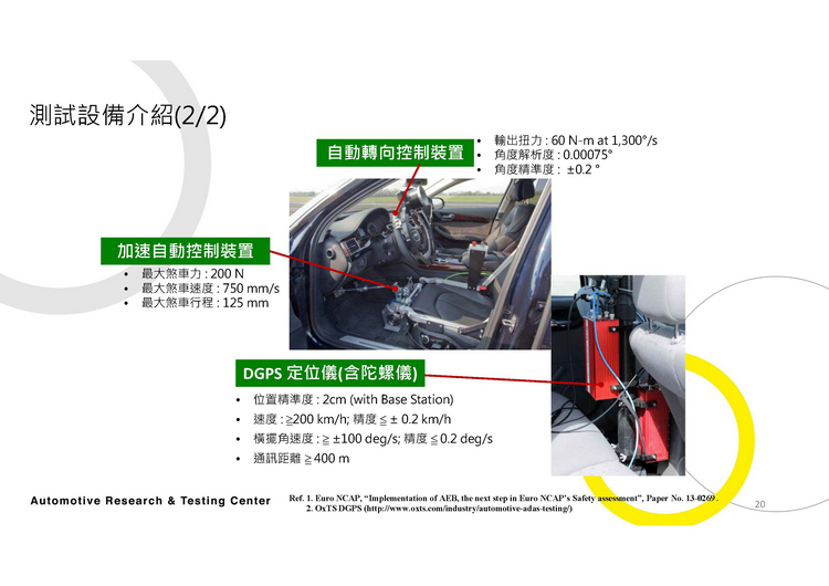 至於測試設備部分,會在受測車輛上安裝自動轉向控制裝置(俗稱方向盤機器人)、加速自動控制裝置、控制電腦、DGPS定位儀(含陀螺儀)、警示訊號量測設備等,讓機器來負責駕駛車輛進行測試,坐在駕駛座上的人員只負責將車子開到測試起跑區與監督整個測試過程。或許有人會問,為什麼不直接讓測試人員直接駕駛測試就好呢?這主要是因為要讓每次測試都精準符合規範要求(如偏移時車速72km/h、側向偏移率0.1-1.0m/s)對於人類操作者來說是很難做到的,所以才以機器駕駛方式來執行。