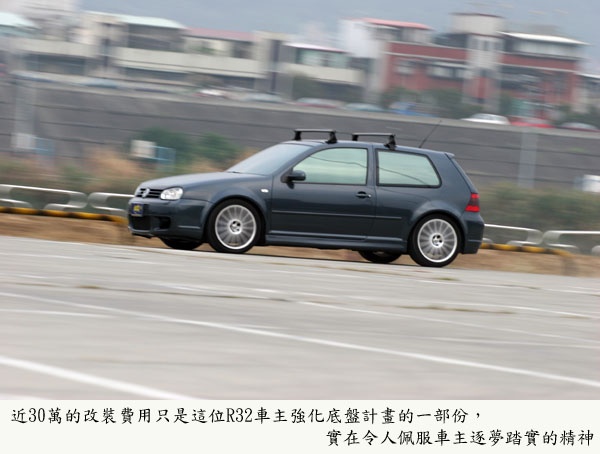 由於造車理念和民族性的不同,歐洲車的改裝方向很少像日系車一樣弄得很花俏,因此當採訪組抵達飛翔汽車時,從該部R32外表看不出它到底動了什麼手腳,這也是許多玩家當初會偏好較內斂的歐洲車原因之一;而對於底盤的改裝,大多數的歐洲車底盤 只要稍事改裝便能容易感覺出改裝後與原廠的差異,何況是已經全面換上改裝品的這部車。