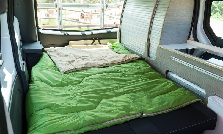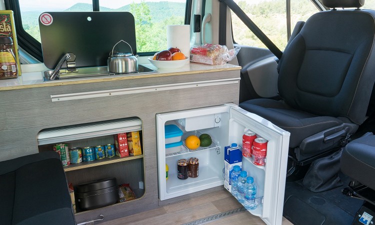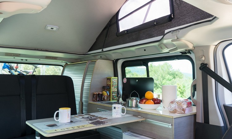 改成露營車後,車內會有一張收納桌、椅,晚上睡覺時可變成床鋪,掀頂的車頂可另外帶來兩個床位。車內還有冰箱、瓦斯爐、洗手台等所需配備,在盡可能空間內滿足露營客基本需求;車廂內多處有收納空間,擺放雜貨、衣服、床被等日常用品。