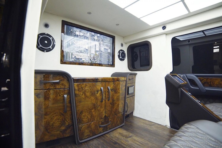 後排還配備了帶有Apple TV的4K超高清電視監視器,能使用Apple Siri的語音控制做任何資料查詢,附帶冰箱可存放任何飲品。兩張頂級座椅可完全傾斜休息,具備按摩功能來紓壓;同時乘客可透過控制鍵來調整有日光功能的頂棚,畢竟防彈車的玻璃為不可透視,模擬真實陽光的頂棚燈可減少疲勞度。