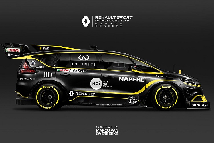 自由作家設計師Marco van Overbeeke手繪出新Espace F1 MPV的模樣,照片上看起來相當狂野。對於新的F1賽車外型空力套件、輪胎已做了很大修正;像是2018年Renault F1賽車對於空氣力學部件上有大幅度升級。這些包括後尾翼、訂製的後擴散器、前分離器以其向後延升的沙魚鰭,都與當時F1賽車有很大差別。另外,車身彩繪有著全新樣式,黑色與黃色強烈對比色互相搭配,神秘感中又帶有運動氣息。