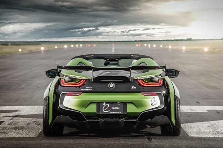 來到車尾與車頭相互輝映,線條的風格完全相似,下方有大型的擴散器,能快速的排出亂流增加車輛穩定性,上方則有大型GT尾翼,對於跑車來說非常匹配,可是在混合動力電動車上,顯得有些誇張。EVE.RYN的改裝風格在暴力中帶有特殊美學,車身外觀顏色刻意用特殊綠色、深綠色以及原碳纖維原色,就連引擎蓋上的BMW廠徽藍色部分也改為綠色。車身上看的到EVE.RYN的廠家標誌,低調的用消光顏色處理。