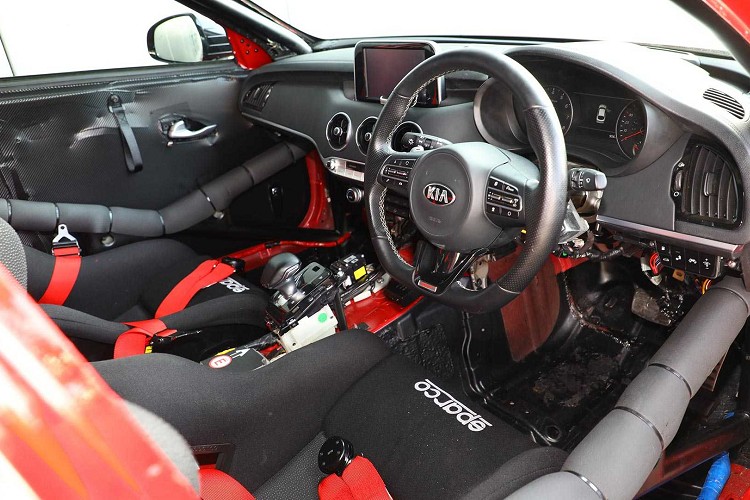 Kia打算將Stinger GT420用於賽道上,因此內裝已全數移除,並拆除後保桿防撞內鐵盒一些隔音泡棉,內裝天窗被鋁板給取代,以便減輕車身重量。該車還配備一套標準防滾架和底盤強化桿增強車身剛性。經過一系列的減重,該車比起市售版本降低150公斤之多。當然車內還有包覆性極高的桶型座椅以及六點式安全帶,這些都比賽時能保護車手的安全防護。