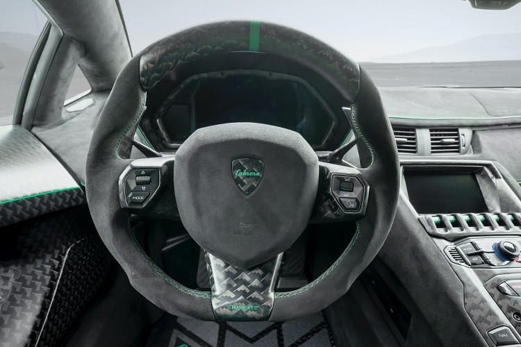 這些特殊的輪弧足夠容納前20吋規格與後21吋規格的Mansory鍛造鋁圈,輪胎使用倍耐力P Zero,規格前255/30R20和後355/25R21。車身塗裝使用特殊的Vento Verde特殊顏色與內部醒目的綠色相呼應,車艙內大量運用Alcantara和高檔皮革包覆,提高超級跑車的奢華感。