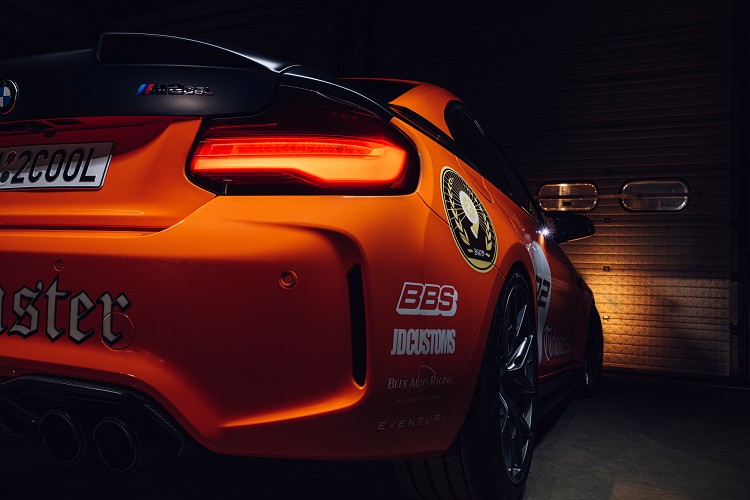 這輛車的外觀採用相當有歷史的2002經典橘色,並搭配上黑色塗裝作為M2 CSL的基本底色,完全是參考2002 Hommage,只是改用到M2 Competition車型之上。車頂採用Alpha-N碳纖維部品,有效的降低重量以及重心,左右雙出的排氣管則是選用台灣俗稱蠍子管的Akrapovic,一併訂做中間的下擾流,整體感覺相當一致。