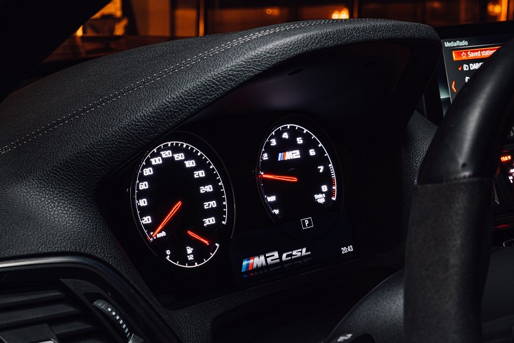 當你打開車門時,在夜晚會先看到引人注目的照地燈,車內大量使用Alcantara麂皮和高檔皮革包覆,方向盤12點鐘方向有紅色定位點,後方則有訂製的換檔撥片。另外,車內可看到碳纖維套件,包含排檔桿和手煞車;中控台出風口位置則有改裝儀表板,能隨時監控車輛各項溫度資訊等。這輛M2 CSL可以說算是為終極改裝車,透過各改裝品牌強項,結合成為非原廠出品的最終極BMW M2。