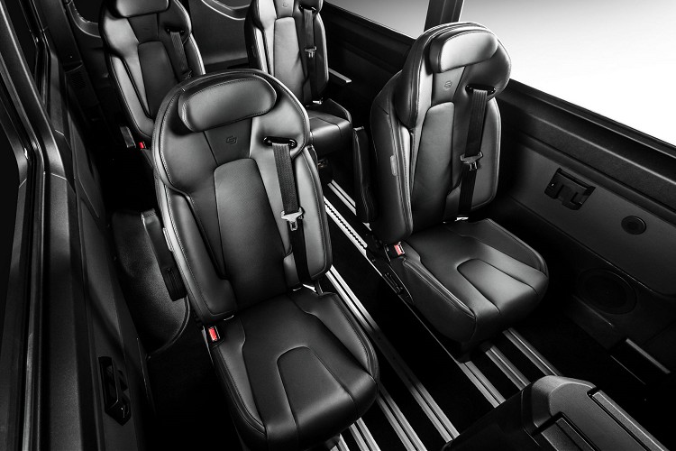 升級後的Mercedes-Benz Sprinter,後座採四張獨立座椅,每一張經過皮革包覆升級後,就如同飛機上頭等艙水準。厚實的椅背搭配上可調整角度,輕易調整到最佳坐姿,中間位置還有一個可調整桌子,使用者可隨時調整搭配座椅同步使用。