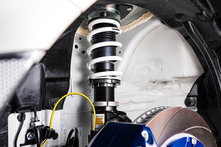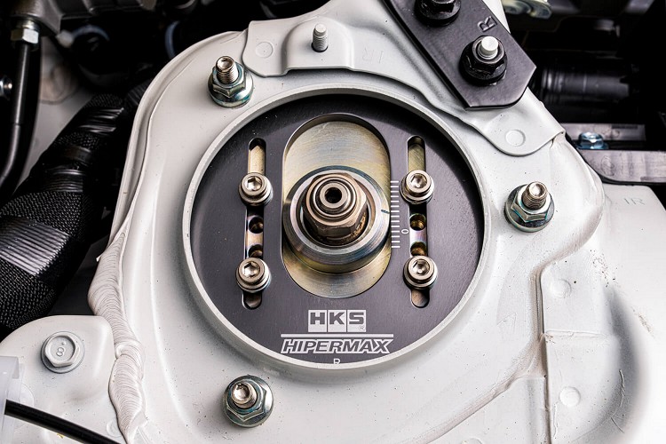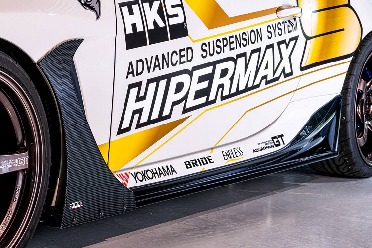 底盤部分,換裝HKS自家改裝品Hipermax S coilovers,優化的彈簧設定和避震器阻尼調整,再加上自家低摩擦技術,是HKS史上乘坐最舒適又能兼具樂趣的避震器。此外,鋁圈品牌選用Advan GT系列,輪胎則是Yokohama Advan Neova性能胎,抓地力和過彎極限有所突破。