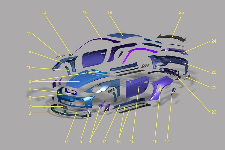 通常對於改裝碳纖維套件的認知,就是把前保桿、引擎蓋、後保桿以及側裙、尾翼等外加部件改成碳纖維材質。不過,對於TopCar Design來說,這樣子改就太沒意思,他們針對992 Stinger GTR Limited Carbon Edition推出84個部件,每個部件由四層碳纖維布製成,一層外部、一層內部以及兩層結構層所組成。為了更了解修改程度,他們公布了一張照片讓消費者能更清楚明瞭。