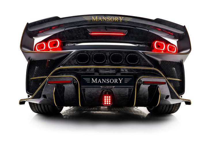 車頭前臉相當激進之外,車尾也不惶多讓。誇張到有些古怪的大型尾翼,在高速時可帶來相當大的下壓力。後引擎蓋改成鍛造碳纖維材質,特殊的造型加強進氣效率,對引擎效率有很大幫助。保險桿有乖張的後擾流,排氣管位置在極為特殊,採四出設計,從車位看上去就知道它並非等閒之輩。