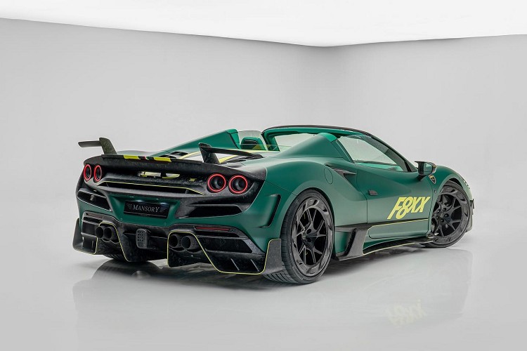 終於來到車尾,首先配備一對明顯的鍛造碳纖維小尾翼,靈感來自法拉利FXX K的相同感覺。此外,引擎蓋重新設計,兩邊帶有散熱孔,透明的蓋子剛好可展示最強大動力心臟。後保桿下方安置大型擴散器,與原廠相比效率大大提升。排氣管為四出設計,中間則是類F1的後霧燈。車身外觀塗裝以醒目的綠色為基礎,搭配上黃色彩繪與F8XX字樣,營造出一種特殊另類氛圍。