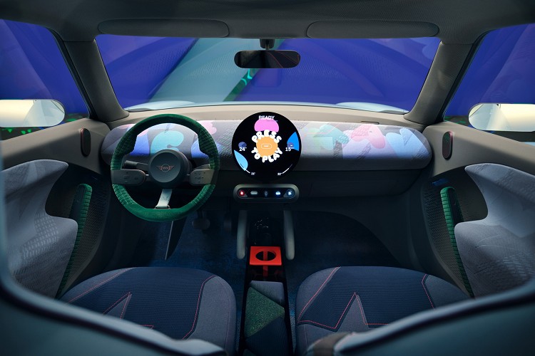 車頭水箱護罩這記了一圈燈光,燈光與車頂顏色相互呼應,夜間行駛更能提升辨識度。左右的大燈為多邊形,跳脫大家所認知的MINI圓形車燈,外圈依舊保有LED日行燈,與現行MINI車款相比,概念車的造型風貌有著很大突破。概念車的外觀沒有用到太多鍍鉻材質,車頂施以活潑的綠色,車身則是淺淺的藍色,其餘還看得到點綴的藍色、紅色、粉色以及橙色,並結合黑色塑料鈑件,外觀展現出十足魅力和個性。