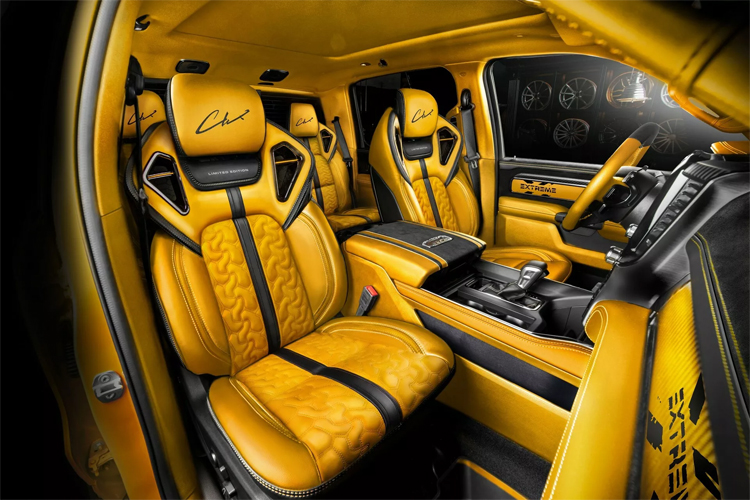 進到車內,才是整輛車最有亮點之處,Ram內裝每個飾板都包覆上天然皮革,其中包過座椅、方向盤、門板、中央鞍座、中控台以及儀表板等,都包覆上黃色皮革。其餘地方則是用上亮黃色 Alcantara麂皮與黑色 Alcantara包覆,其餘小地方還看得到有趣的黃色碳纖維元素,對於車輛內部有著很大的質感提升。