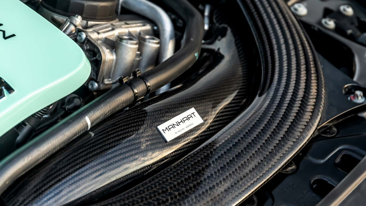 這顆引擎是否更換新的本體、曲軸、連桿和活塞等內部部件尚不清楚,但在引擎外觀上方,會發現新的渦輪增壓器以及與之相連的所有組件。這包括中冷器、管道、排氣管等等。還有一個新的碳纖維進氣口,為了讓一切運發揮到最大效益,Manhart特別針對ECU進行調校。
