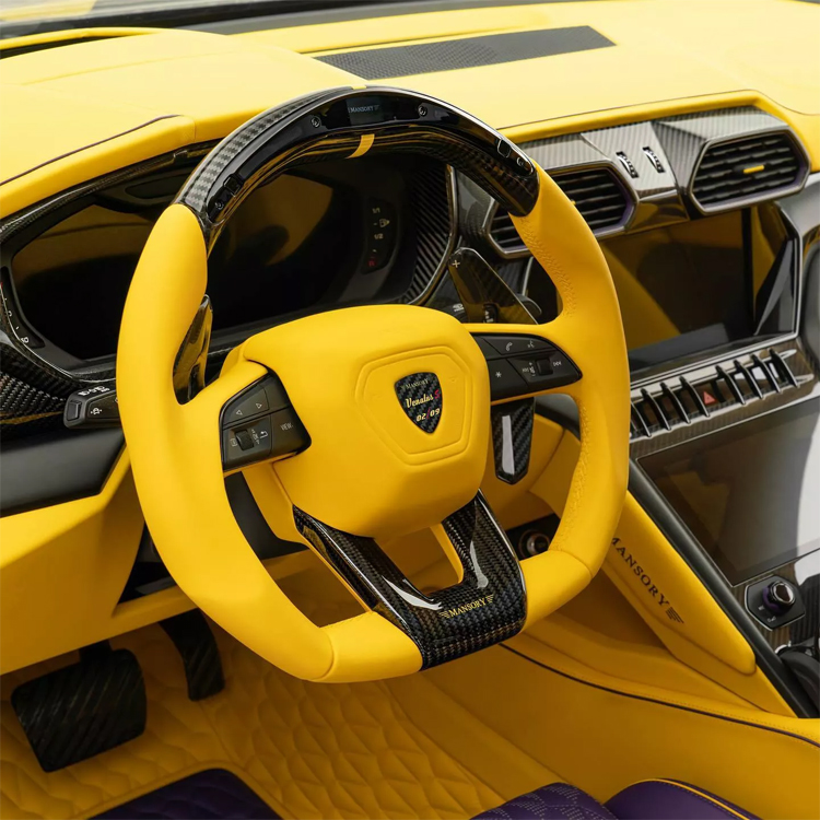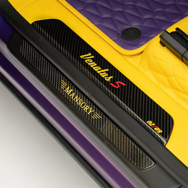 進到車內,第一眼感覺是NBA洛杉磯湖人隊的配色,駕駛座椅紫色皮革為主要色調,中間有一條黃色條紋,副駕座椅則是黃色為主色,中間一條紫色條紋,後座也是依照前座樣式打造,雙色調是車內特別營造出的風格樣式。至於車內其他部分,則是統一使用黃色皮革包覆,同時還搭配碳纖維飾板讓車內更加戰鬥。