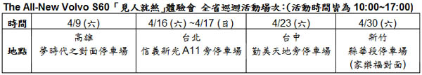 VOLVO全球獨創之安全科技—The All-New Volvo S60「見人就煞」體驗會 本周正式開跑![]() ▲PDFAB行人偵測暨完全主動煞車系統偵測示意The All-New Volvo S60所搭載的全球首發PDFAB行人偵測暨完全主動煞車系統,透過電視廣告播送,讓許多人讚嘆全新S60「見人就煞」的領先安全科技,而為了讓更多的消費者能親身體驗VOLVO獨步全球的安全科技,國際富豪汽車特別於全國北中南三區規劃了The All-New Volvo S60「見人就煞」體驗會,首場活動將於4/9本周六於高雄夢時代廣場正式登場,歡迎所有喜愛全新S60的朋友們親臨現場見證敢與眾不同的「見人就煞」安全科技魅力。最重要的是,凡親臨試駕的消費者皆可獲得VOLVO限量環保提袋外,填寫問卷還有機會抽中Apple iPad WiFi + 3G版16GB、Sony PS3 + GT5遊戲及百項北歐精品好禮。欲知更多活動詳情,請前往VOLVO官網:http://www.volvocars.com/tw
