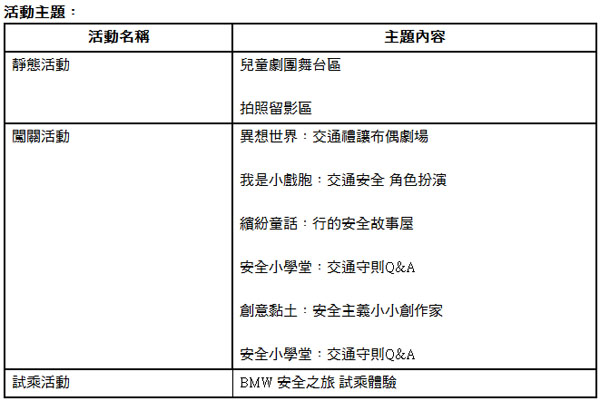 ![]() ▲2010年BMW兒童交通安全體驗營在台北舉辦成功BMW總代理分公司 台北汎德舉辦之「2011 BMW兒童交通安全體驗營」活動資訊如下: