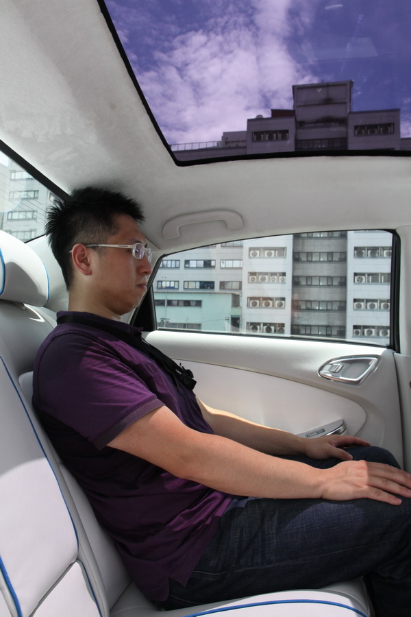 為了營造動感,官方當時出現所謂著筆回鋒這般的形容詞。這對平時不大愛看書的車迷來說有點模糊,套句車界比較能接受的語彙便是短C柱的設計。但這樣一來有了動感卻失去後座頭部空間的表現。 因此從座位底部到頭頂的距離約莫860mm,我們的對照模特兒幾乎頂到車頂。但這台車其實在座椅細部的厚薄軟硬來會調整,因此實際的表現在正市上市時還是會有所變動。