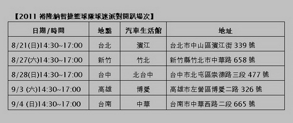 身為裕隆納智捷籃球隊的球迷,最期待的就是暑假期間全台開趴的球迷派對活動,不僅可以獲得全新球隊專屬紀念海報,還可以近距離與心儀的球星拍照合影!今年的2011裕隆納智捷籃球隊球迷派對將於8月21日~9月4日周末期間巡迴台北、新竹、台中、高雄、台南等地,活動內容除了分組趣味互動遊戲、拍照握手簽名會之外,最特別的是,今年的開場活動將由球星們進行熱舞表演,炒熱現場氣氛,保證會讓全台球迷感受到熱辣籃球火的超快感。