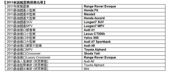 【2011車訊風雲獎】評選結果正式出爐!經過21位來自汽車媒體、專業車手、學術單位及藝人評審的嚴格評選,經過兩輪的不記名投票決選,Range Rover Evoque最終獲得多數評審的肯定,榮獲2011年度風雲車大獎!評審團同時評選出13個級距的年度最佳車款,提供國內消費者購車時的重要參考依據。 除了專業評審選出的年度風雲車及各13個級距的年度最佳車款外,從9月26日至11月3日於車訊風雲獎官網上所舉辦的【2011車訊風雲獎年度風雲車預測活動】,獲得廣大車迷熱烈迴響,經過統計,由Audi A6獲得眾多網友投票支持,並獲選為【最佳人氣車款】,另外Toyota Alphard與Mini則分別獲選為【最佳型男車款】及【最佳靚女車款】。