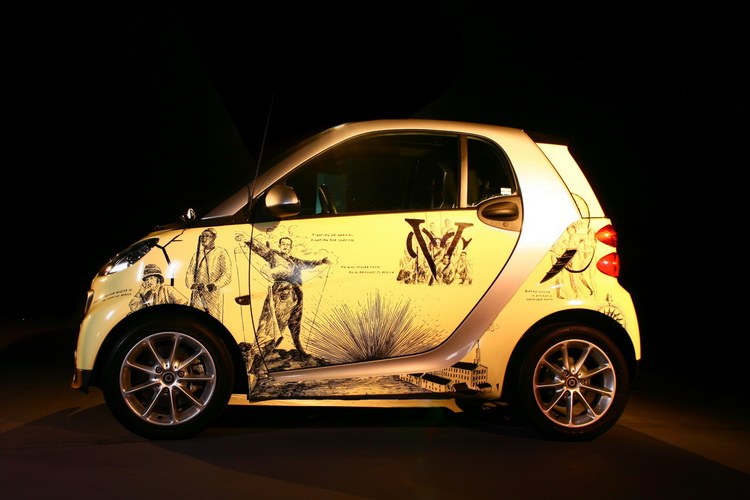 出自台灣本土的塗鴉藝術家Bbrother之手的smart fortwo彩繪車,車身以大膽鮮明的黃色為主體,搭配銀色tridion安全車架,圖案畫作名稱則為「水牛戰士Buffalo Soldier」與「給魯迪的信A Massage to You Rudy」,主題在闡述英國光榮革命與時尚工業的歷史,以及殖民歷史與歐洲織品泛非洲主義的關聯。Bbrother的塗鴉風格強調影像與地緣的關係,使影像入侵城市環境變成一種「事件」,一種對空間權力關係的錯置與干擾,老照片中的人物、歷史故事中的角色、社區、廢墟、都會邊緣場所,都可以轉化成時尚語言,成為他創作的靈感素材。Bbrother塗鴉作品包覆在smart fortwo車身上,賦予「藝術X時尚」新的生命力。
