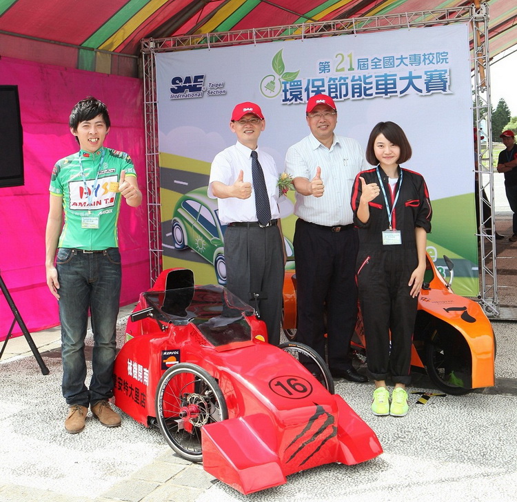 ![]() ▲環保節能車大賽競爭激勵 上百位同學為環保車款加油.JPG由產官學研各界共同組成的中華民國自動機工程學會(SAE TAIPEI)自81年舉辦首屆省油車競賽起,至今已邁入第21屆,每年都吸引許多青年學子報名參賽。親手策劃本屆環保節能車大賽,同時也身兼SAE 理事長及中華汽車協理的陳清亞表示,辦理環保節能車大賽除了宣導政府環保能源政策,更落實了「節能減碳」觀念,加上近年來業界對於綠能人才求才若渴,透過比賽更能激勵學生對車輛提升燃油效率及新能源動力的研究,提前為自己的職場履歷加分。我們也期待藉由國內學子技術研究的創意,不但能帶給業界良性的互動與刺激,更能提升台灣車輛技術水準,成為促進國內車輛工業資源整合的有力踏板。 ![]() ▲第21屆環保節能車大賽開跑 吸引全國29隊環保車隊伍參賽![]() ▲ 環保意識抬頭 大華大學選用竹編環保材質打造九降芎瘋環保車成為最吸睛車款本屆競賽結果如下: 1. 車輛製作獎第一名:台北科技大學 車隊:Green Innovation 2. 省油車獎第一名:台北科技大學 車隊:Evolution III 3. 電動車獎第一名:虎尾科技大學 車隊:Formosa Vehicle 4. 精神總錦標獎:陸軍專科學校 車隊:陸專傳奇 5. 最佳創意獎:大華大學 車隊:九降芎瘋 競賽活動裁判長車輛測試中心副總經理廖慶秋高興的說:本屆競賽競爭激烈,不僅以秒殺的速度完成報名,今年在省油車及電動車都有很創新的造型,且作品較以往作品更具創意與實用性,流線與採光都有考慮,整體表現在水準之上。 ![]() ▲ 陸軍專科學校以英勇士氣及運動家精神獲得精神總錦標獎![]() ▲SAE陳清亞理事長及林永裕副理事長與參賽環保車合影 為參賽同學加油