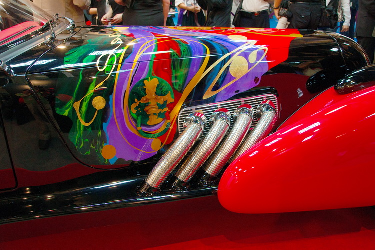 ![]() 請台灣藝術家李善單與「Vicci 6.2 帝王Ⅰ」新古典藝術超跑跨界合作的DiMora迪摩拉汽車總裁阿爾弗雷德‧迪摩拉(Alfred J. DiMora)談到合作緣起時表示,當時在美國比佛利寶勝畫廊深受氣勢磅礡的「大將門」創作所吸引,畫作中充滿爆發力的色彩與線條,既東方又當代。因而邀請李教授將其「大將門」創作與DiMora即將在2014年發表的新款跑車Vicci 6.2 結合,為古典跑車注入當代藝術新元素。