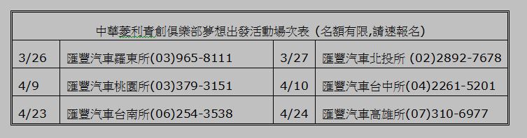 此外,長時間與頭家互動之餘,中華汽車發現許多有創意有想法的青年想自行創業卻欠缺知識和資源,於是在3/26起在一連舉辦六場免費的「中華菱利青創俱樂部夢想出發」活動,會上將安排達人分享創業方程式、胖卡協會理事長龔修賢分享行動車商機、營業用車體內外改裝解析,會上可一邊享用下午茶,一邊與成功頭家互動,讓有意者一舉取得完整的創業資訊,為人生找出新方向,活動人數有限,請依所在地區位置儘速報名以免向隅。活動詳情請洽全省匯豐汽車展示中心或至官網查詢http://www.5230.com.tw/act/2016dream/#