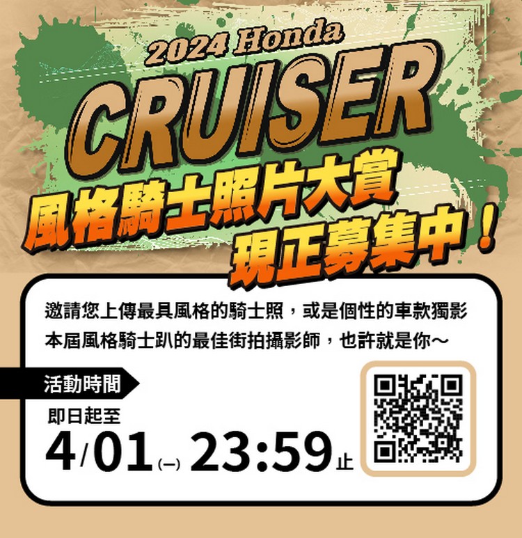 ![]() 2024 Honda Motorcycle Cruiser 風格騎士趴專為匠心獨運的車主設計揮灑自我的精彩活動,以《風格》為主題,舉辦《風格騎士大賞》,展現” 專屬的騎乘戰袍”,以及”獨有的改裝品味”,並同場加映”風格騎士照片大賞”,邀請您上傳最具風格的騎士照,或是個性的車款獨影,就有機會獲得相關好禮。為了讓所有參與的車主更加方便了解各項資訊,相關報名事項及活動辦法將透過以下表單公告:https://forms.gle/2MJhKRYJiccNqqTb6。