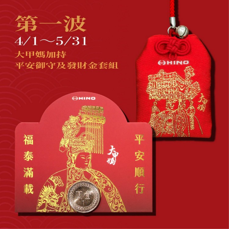 ![]() 即日起至5月31日,凡購買HINO商用車及TOYOTA COASTER、GRANVIA、HIACE之顧客,以及活動期間回廠保修之車主,即贈送HINO精心設計的大甲鎮瀾宮加持「平安御守及發財金」套組乙份。4月10日起至5月31日,加碼贈送「大甲媽壓轎金」乙份。藉由媽祖賜福,保佑HINO車主行車平安,福氣滿滿。 ![]() ▲大甲鎮瀾宮加持「平安御守及發財金」套組、「大甲媽壓轎金」