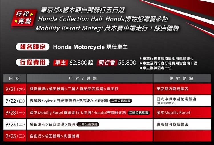 ![]() 為了持續實現「Be Your Wing」的品牌精神,讓更多Honda車主體驗各種不同二輪的樂趣,Honda Taiwan今年為車主舉辦「2024 Honda Motorcycle茂木之旅五日遊」於今日8/19正式展開宣傳,並於8/23開始受理報名,活動內容包含自駕體驗日本絕美公路,參訪 Honda Collection Hall 博物館,認識 Honda 精湛工藝與歷史,並在 Mobility Resort Motegi 享受茂木賽車場走行體驗深度騎乘文化體驗等,過程中將與Honda人氣機種一同體驗壯闊且迷人的栃木縣風光,歡迎熱愛Honda的所有車主把握本次機會開始報名吧!