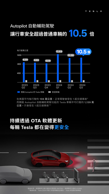 近日發布之 Tesla 2024 年第三季度車輛安全報告指出,使用 Autopilot 自動輔助駕駛系統,可讓行車安全超過普通車輛約 10.5 倍,Tesla 持續透過 OTA 遠端軟體更新強化車輛安全性與可靠度。專為安全與實用性而設計的全球暢銷休旅車款 Model Y 不僅如 Cybertruck 一樣具備超過 2,100+ 公升載物空間,更榮獲全球多個安全評測權威機構最高五星評級,車輛關鍵部位使用馬氏體不鏽鋼,顯著提升車身強度,其車頂結構約可承受兩頭成年非洲母象之重量。