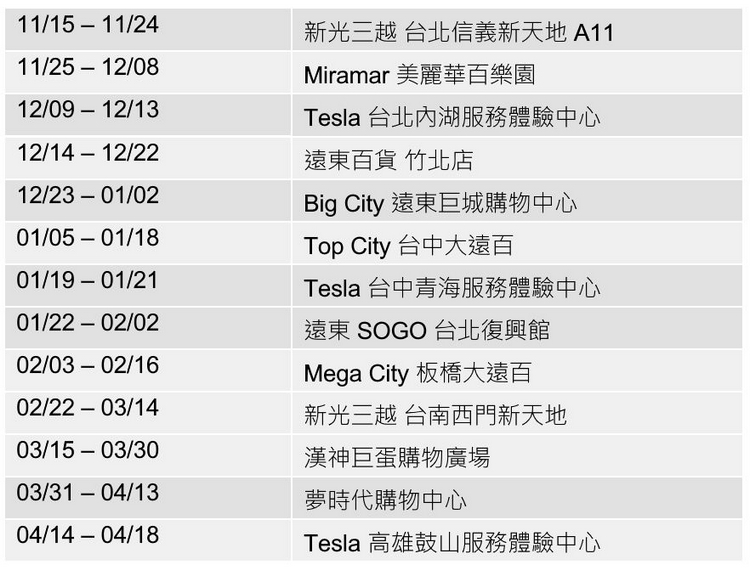 Cybertruck 硬派巡展即日起於新光三越 台北信義新天地 A11 體驗店開展,陸續將前往北中南超過 13 個站點,將使全台消費者與車迷有機會一睹 Cybertruck 獨特魅力,參與 Cybertruck 硬派巡展並完成指定步驟即可兌換限定明信片,每一站點前 50 名參展者更可獲得硬派巡展限定紀念海報。備註:Cybertruck 硬派巡展僅提供車輛靜態展示,目前尚未上市與進行車輛交付,巡展時程與地點如有異動以官方公告為準。