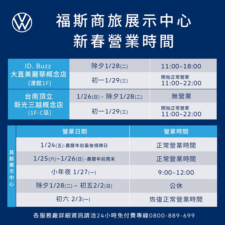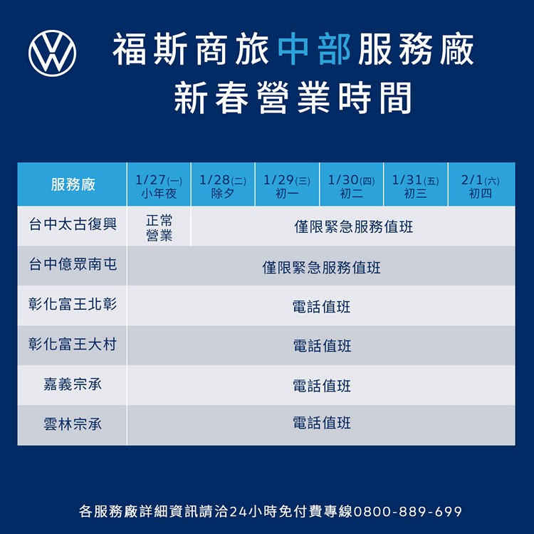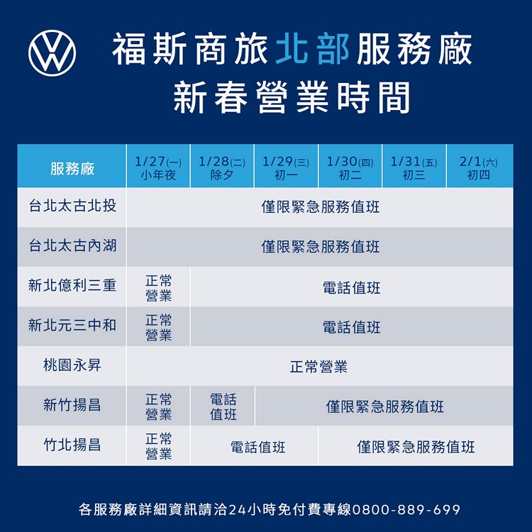 福斯商旅新春營業時間公告迎接農曆新年假期到來,台灣福斯商旅於今日宣佈全台展示中心暨服務據點之春節營運服務時間如下:
