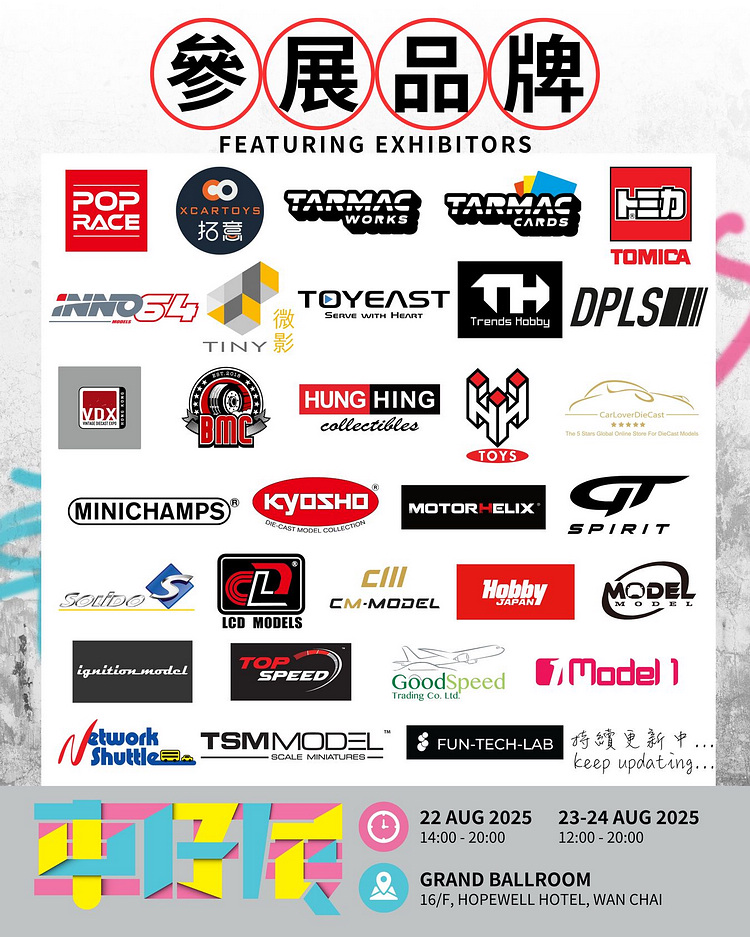 今年「車仔展」首次移師至灣仔合和酒店合和大禮堂舉行,場地面積逾3萬平方呎,比去年大四倍。參展品牌及展商數量也創下歷屆新高,吸引更多海外品牌專程來港參展。活動將有首次參展的日本知名品牌Tomica,以及港澳品牌POP RACE、 Tarmac Works、INNO64、Tiny微影、Trends Hobby、Sparky、BM Creations、鴻興玩具、Model 1,內地品牌拓意、GCD、Motorhelix、LCD Model、CM Model、Fun Tech Lab及其他地區日本品牌京商、Hobby Japan、Ignition Model、德國品牌Minichamps、美國品牌DPLS、Greenlight等知名廠商前來參展。