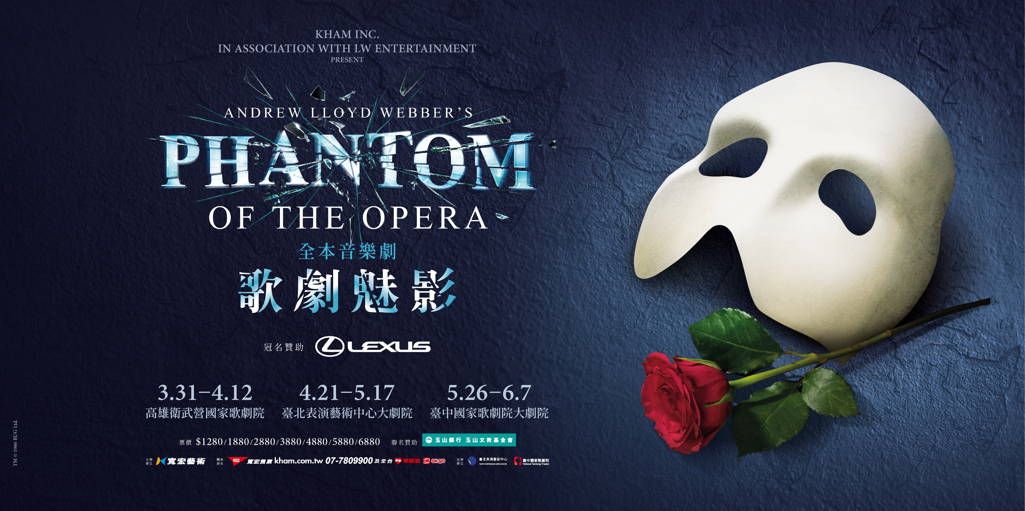 【LEXUS 車主購票優惠】 限以網路購票,請洽寬宏售票系統。凡購買 $4,880(含)以上票區可享 95 折優惠;每組 Lexus 車牌限購 4 張,並於購票時於指定欄位填入車牌號碼以核對身份。優惠適用於高雄衛武營、台北表演藝術中心及台中國家歌劇院等演出場次。相關票務資訊與購買方式請依寬宏售票官方公告為準。 《歌劇魅影》2026年全本音樂劇巡演資訊 ■ 開賣日: 2025年11月19日(三)下午2點正式啟售 ■ 購票: 高雄、台北、台中場次請洽寬宏售票系統(客服專線 07-780-9900) ■ 票價(不分場館): $1280 / $1880 / $2880 / $3880 / $4880 / $5880 / $6880 ![]()