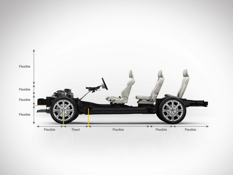 這套底盤是VOLVO汽車經過四年時間研發,同時也是他們投資110億美元進行的轉型計畫中的重要核心,除了率先搭載於新一代XC 90外,未來也將陸續導入旗下各個車系。採用這套底盤讓VOLVO的設計師與工程師在研發設計上得到了極大的自由空間。例如在設計上對於軸距、懸身、車輛高度與車頭高度的一些限制現在都被解禁。這也讓新XC 90擁有與家族弟兄大不相同的外觀輪廓與風格。
