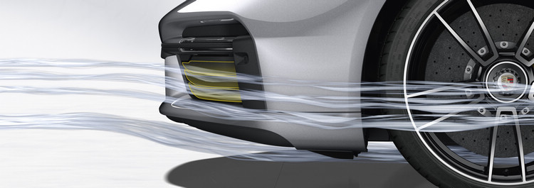 ▲911 Turbo S具備三項主動式空氣力學部件:全新設計的主動式冷卻空氣閥門、可變式前擾流翼,與可延伸、調整傾斜角度的尾翼。